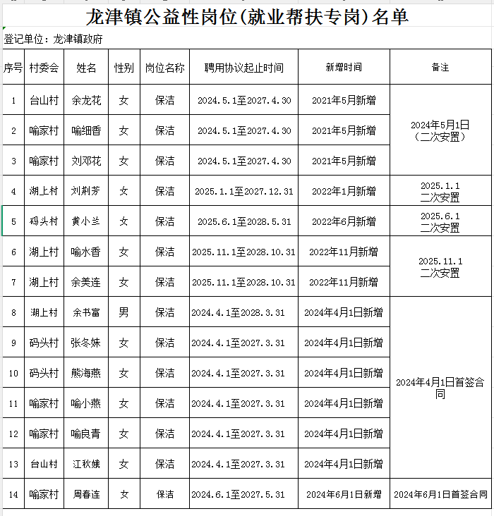 龙津镇公益性岗位(就业帮扶专岗)名单
