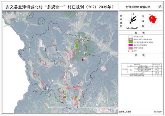 村庄用地:总面积为77.23公顷,相对于规划基期,减少了2.55公顷,主要来源于低效建设用地腾退。