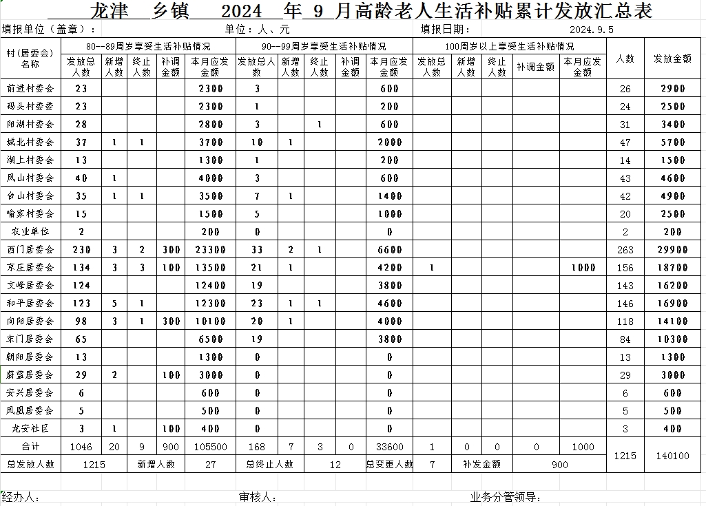 2024年9月份龙津镇高龄老人生活补贴累计发放汇总表