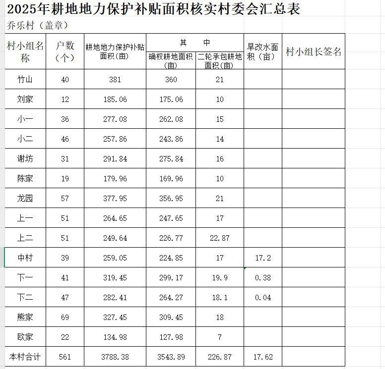 乔乐村2025年耕地地力保护补贴面积核实村委会汇总表