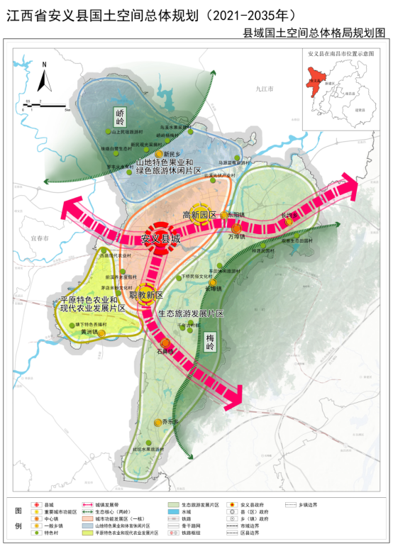 确立国土空间总体格局。构建“一核、两带、两岭、三片”的国土空间开发保护总体格局。一核:县中心城区,包括县城、高新园区和职教新区。两带:打造沿G353/G354/南安公路的城镇综合发展带,以及沿龙安大道—杭长高速(昌铜段)的城镇特色发展带。两岭:是指峤岭山脉、梅岭山脉。三片:北部新民打造山地特色果业和绿色旅游休闲片区,西部黄洲、鼎湖打造平原特色农业和现代农业发展片区,东部沿南昌西二绕城高速公路,打造生态旅游发展片区。