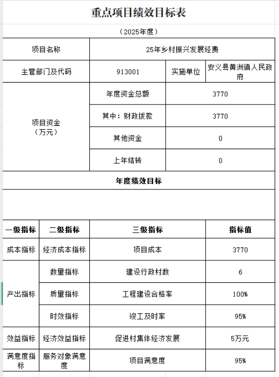 1)项目概述:按照《江西省财政衔接推进乡村振兴补助资金管理办法(试行)》和《江西省衔接推进乡村振兴补助资金绩效评价及考核办法》要求,切实加强衔接资金的使用和绩效管理,充分发挥资金效益。2025年,财政预算安排乡村振兴发展资金3770万元,项目包括:巩固脱贫攻坚成果、推进乡村振兴发展、完善基础设施建设、推进农业农村改革创新等。