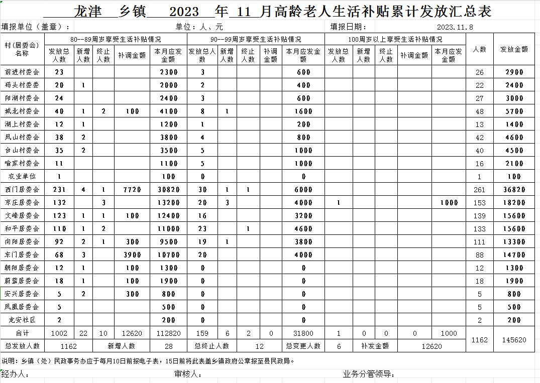 2023年11月份龙津镇高龄老人生活补贴累计发放汇总表