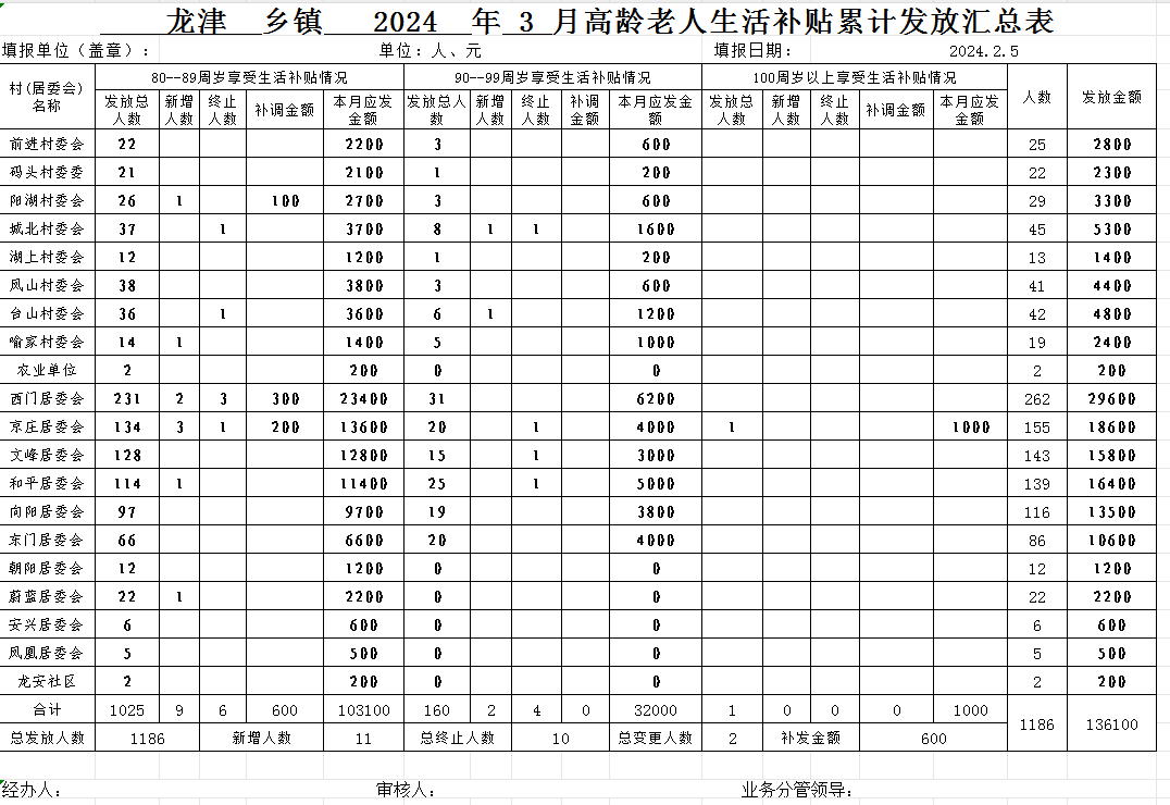 2024年3月份龙津镇高龄老人生活补贴累计发放汇总表