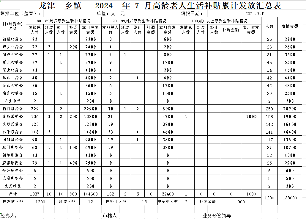2024年7月份龙津镇高龄老人生活补贴累计发放汇总表