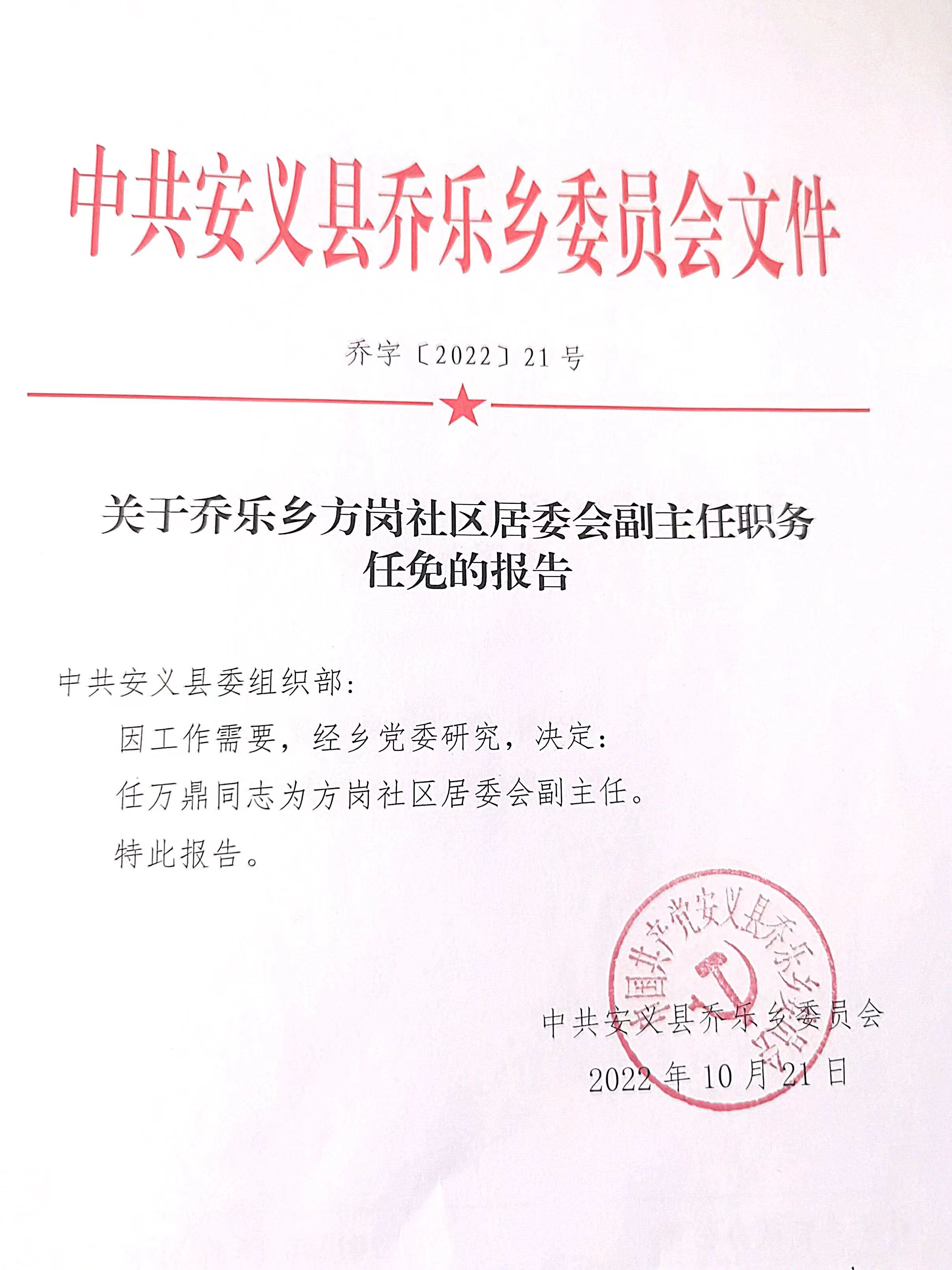 关于乔乐乡方岗社区居委会副主任职务任免的报告