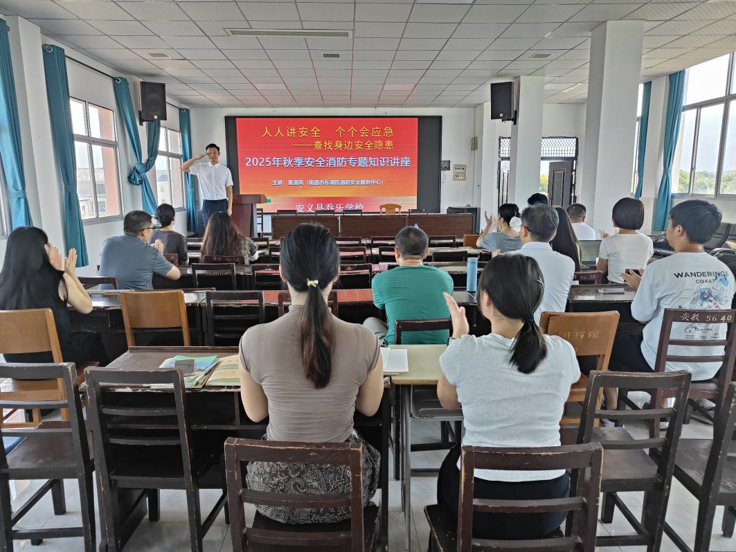 南昌市东湖区消防安全服务中心(南昌消联)在安义县乔乐学校成功举办了一场以“人人讲安全、个个会应急——查找身边安全隐患”为主题的秋季消防安全专题培训。全校教师齐聚教室,认真聆听讲座,积极参与互动,现场学习氛围浓厚。