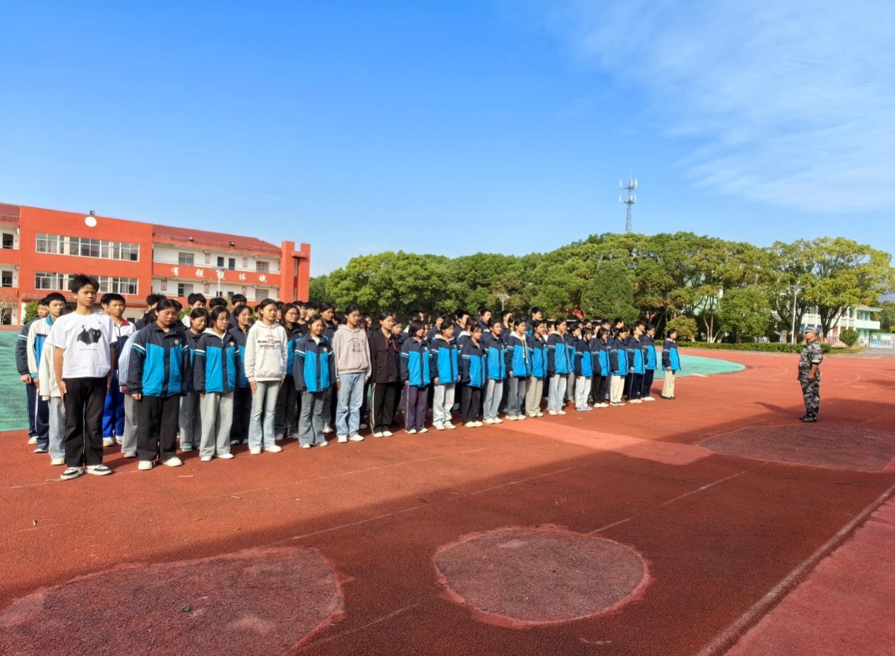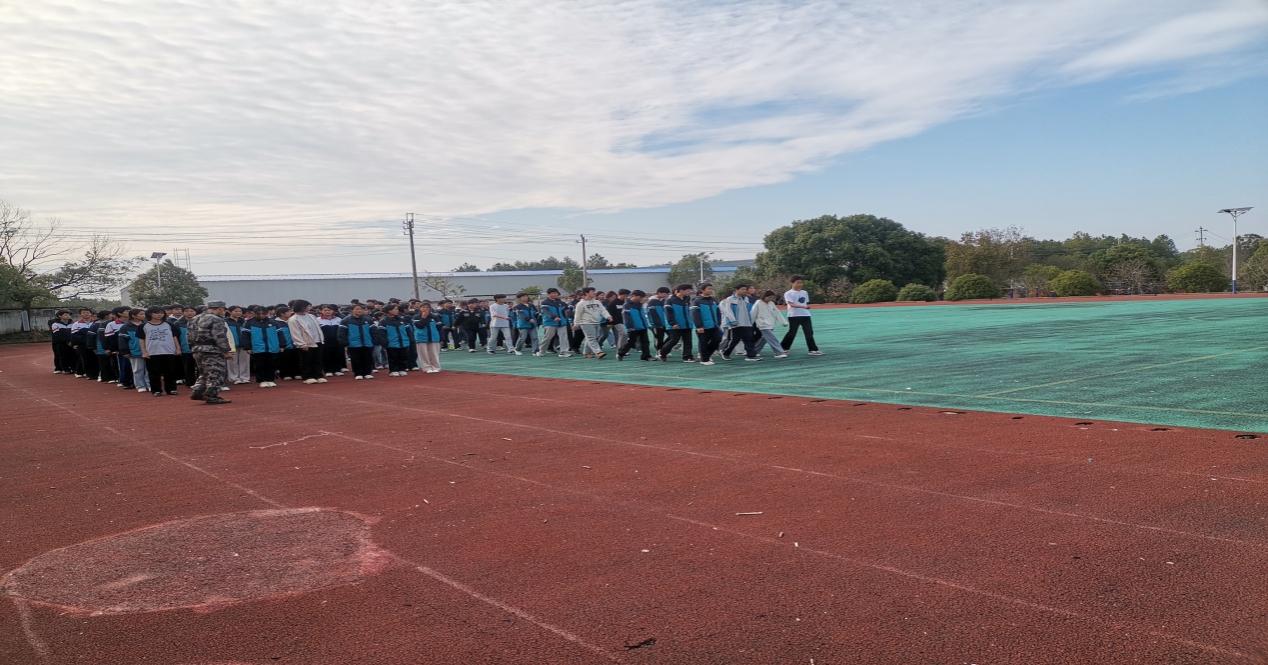 下午是乔乐学校六、七年级同学们的军训。训练场上飘荡着教官的口令声,同学们从最基础的站军姿、齐步走开始,到正步走、队列变换等科目。站军姿时,同学们汗水湿透衣衫,却始终挺直腰板;齐步走训练中,大家步伐整齐。尽管身体疲惫,但同学们相互鼓励,彼此纠正,从最初的步伐不一到如今的协调一致,展现了出色的适应能力和团队协作精神。蓝黑色的校服、红色的操场、红色的跑道与蓝天白云相互映衬,构成了一幅充满活力与朝气的画卷。