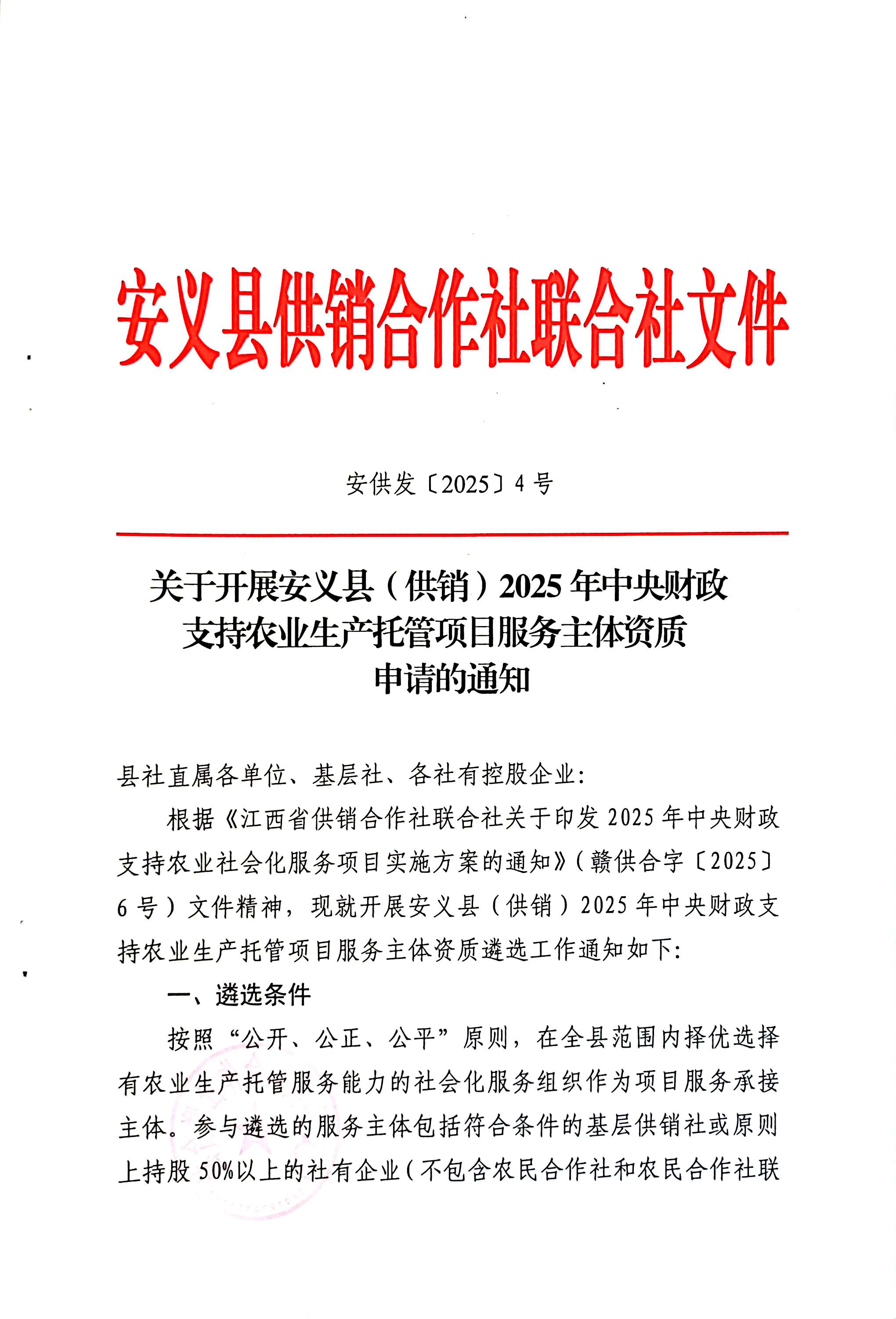 关于开展安义县(供销)2025年中央财政支持农业生产托管项目服务主体资质申请的通知