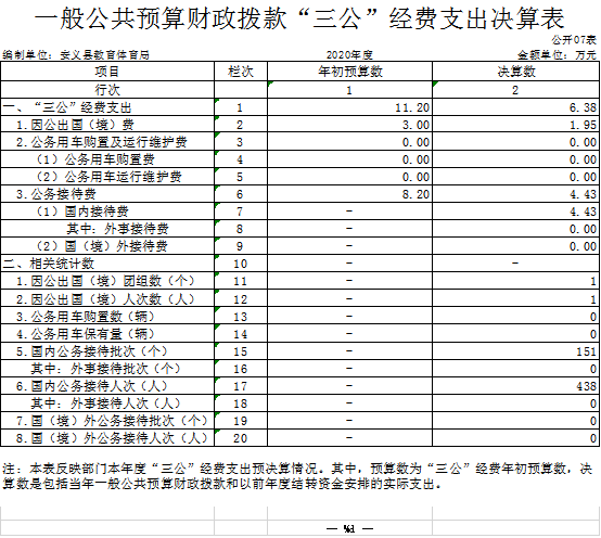 本部门2020年度一般公共预算财政拨款“三公”经费支出年初预算数为11.2万元,决算数为6.38万元,完成预算的56.96%,决算数较2019年减少2.02万元,下降24.05%,其中: