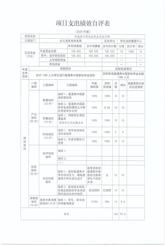 2020年度普通高中国家助学金及免学费项目绩效自评综述:根据年初设定的绩效目标,2020年度普通高中国家助学金及免学费项目绩效自评得分为99.8分。项目全年预算数为 150.032万元,执行数为150.032万元,完成预算的100 %。主要产出和效果:一是产出:全年预算资助学生人数为1385人次,资助金额为150.032万元;实际资助人数1385人次,资助金额150.032万元。资助资金发放完成率100%。二是效果:减轻了普通高中学生经济压力,激励普通高中学生成长成才,适当向农村地区倾斜。发现的问题及原因:一是少数家长和群众对教育资助政策不甚了解,对自己孩子享有的助学金额不清楚;二是部分学生对资助缺乏感恩心。下一步改进措施:一是县学生资助管理中心进一步加强教育资助政策宣传,使得家喻户晓。二是把资助项目实施与育人工作相结合,以达到强化资助项目的效果,提升资助育人工作的内在价值。