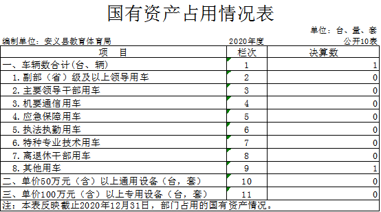 截止2020年12月31日,本部门国有资产占用情况见公开10表《国有资产占用情况表》。其中车辆中的其他用车1辆,该车已车改拍卖,但未销账。