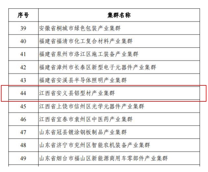 8月30日工信部网站公布,全国共认定了100个中小企业特色产业集群,其中,江西省共入选3个,安义县铝型材产业集群成功上榜。