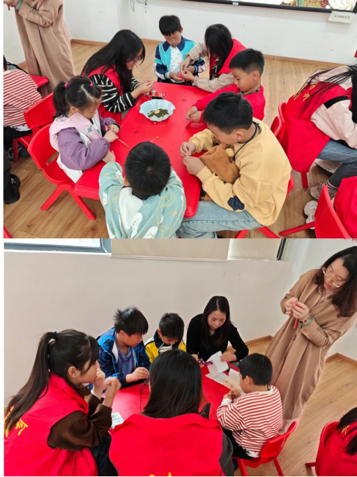 志愿者老师带领大家制作茱萸手工香包。茱萸在重阳节有着特殊的意义,它是一种中药植物,古人认为茱萸能够驱虫去湿、逐风邪。小朋友们围坐在一起,面前摆放着多种制作茱萸手工香包的材料,有红色的绸布、细绳、小剪刀等。志愿者老师先给大家示范了一个简单的茱萸香包的制作方法。