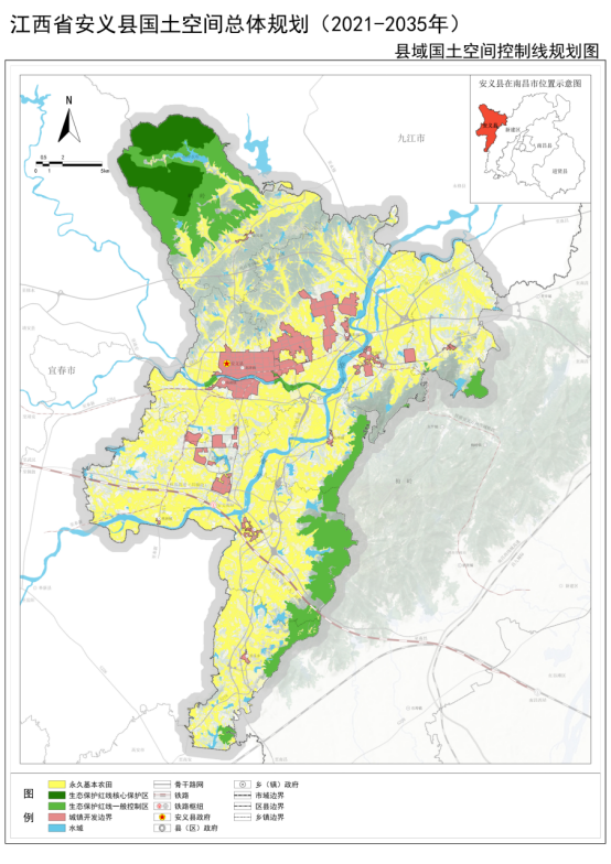 为贯彻落实《中共中央 国务院关于建立国土空间规划体系并监督实施的若干意见》精神,按照省委、省政府和市委、市政府工作部署,安义县人民政府编制了《安义县国土空间总体规划(2021-2035年)》(以下简称“《规划》”)。《规划》是安义县面向2035年可持续发展的空间蓝图,是各类开发保护建设活动的政策和总纲,是编制下层次国土空间规划的法定依据和基础。