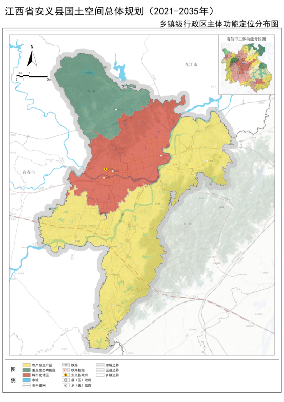 总体定位:明确安义县“乡村振兴示范、特色工业样板、都市休闲基地、山水田园城市”的总体定位。