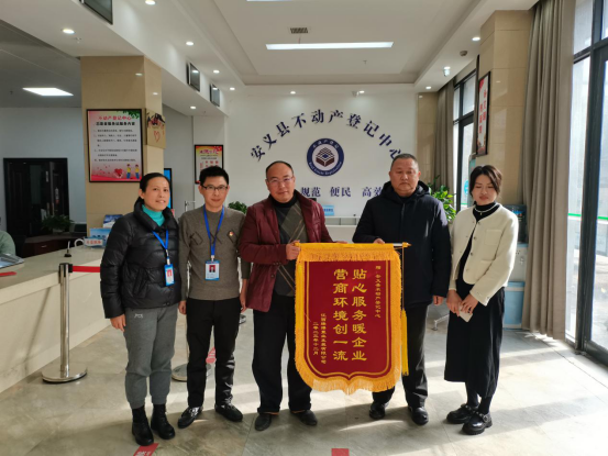 近日,江西臻博置业发展有限公司负责人来到安义县不动产登记大厅,赠送一面印着“贴心服务暖企业、营商环境创一流”的锦旗,以示对中心工作人员贴心暖心的优质服务表示感谢!